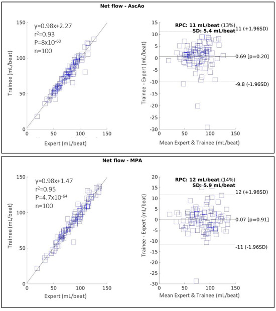 Figure 6 shows the correlation and Bland–Altman plots for the net flow measured in the AscAo and MPA using 4D-flow, comparing a trained annotator with a CMR expert. In AscAo, the performance of the annotator was excellent (0.97 [95% CI 0.95–0.98], = 0.93, MD = 0.69 ± 5.37 mL/beat, p = 0.20, RPC = 10.5 mL/beat). Performance in the MPA was also excellent (ICC 0.97 [95% CI 0.96–0.98], = 0.95, MD = 0.07 ± 5.90 mL/beat, p = 0.91, RPC = 11.6 mL/beat).
