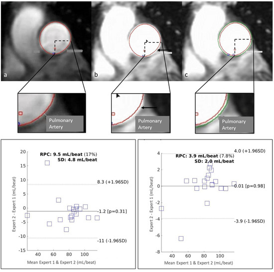 A key early lesson learned from the 2D-PC contouring process was the influence of the vessel boundary definition on flow measurement. Due to the partial volume effect on vessel wall boundaries [22,23], an initial approach to vessel contouring resulted in numerically lower estimates of flow due to the exclusion of pixels adjacent to the vessel walls, which partially contained blood flow signals. The adjustment of windowing revealed these adjacent-wall pixels, and a revised, radially expanded contour resulted in increased measured flow, by approximately 2%, and improved inter-observer reproducibility with a mean difference between the two CMR experts decreasing from 1.2 mL/beat (or 1.2%) to 0.01 mL/beat (or 0.6%) and RPC decreasing from 9.5 mL/beat to 3.9 mL/beat (Figure 7) [24].