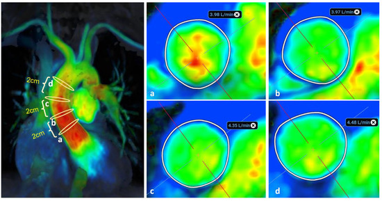 Impact of analysis location on the 4D-flow measurement of flow in AscAo: (a–d) four analysis locations (positions a–d from proximal to distal relative to the aortic valve, 2 cm apart as outlined on the velocity magnitude colour map. Net flow measured in L/min. Color heatmap corresponds with flow velocity (red indicates high flow regions, green indicates low flow regions, blue indicates background static tissue). The cross (+) indicates the centre of regional of interest and the perpendicular lines are used to orientate the regional of interest.