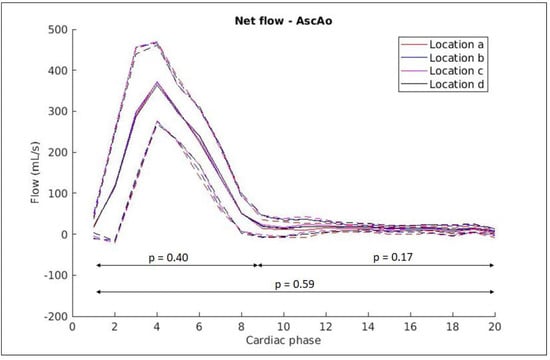 It has been theorised that the predisposition for the formation of strong, asymmetrical vortices or recirculation zones in the ascending aorta potentially has an impact on the precision and reproducibility of flow measurements [25]. The presence of strong zones of turbulent flow may exacerbate flow measurement differences from ROI placement on 4D-flow images between individual annotators. For example, an annotator’s selected analysis location may be relatively proximal or distal to or centred within the region of maximal turbulence (Figure 8) [24]. In our initial analysis, measurements at four locations along the ascending aorta were obtained by a CMR expert in 20 healthy participants. There were no statistically significant differences between measurements obtained at the locations (Figure 9). It is possible that flow in the healthy aorta of the 20 participants was predominantly lamina, and the differences between measurement locations could become more apparent in pathological cases where flow tends to be turbulent.