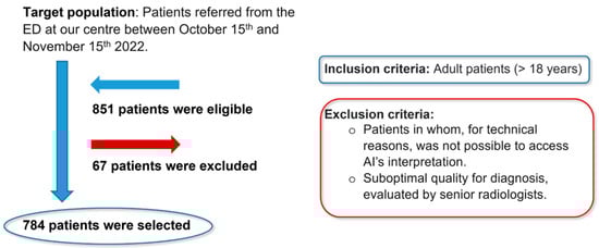Inclusion criteria were radiographs from adult patients (>18 years) regardless of gender, while exclusion criteria included radiographs in which, due to technical reasons, AI interpretation was not accessible, and radiographs of suboptimal diagnostic quality, as assessed by senior radiologists. Of the 851 eligible patients, 67 were excluded, resulting in a final sample of 784 patients (Figure 1).
