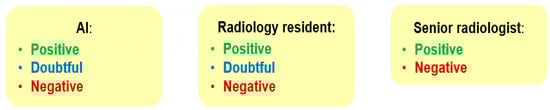 All images were reviewed using a PACS system by three independent readers: two radiology residents and a senior radiologist, who entered the data into a spreadsheet program. One radiology resident (with 1 year of training) independently recorded the AI’s readings. The second radiology resident (with 2 years of training) qualitatively evaluated each examination, assessing the presence of the aforementioned findings and providing a positive, negative, or doubtful result. The senior radiologist (with over 10 years of experience) also independently reviewed each examination, offering either a positive or negative result. Figure 3 shows the possible X-ray assessment results according to the different readers. None of the readers specified the locations of findings within the different lung zones, and all were blinded to both clinical information and the AI’s readings. Finally, the data were fully de-identified.