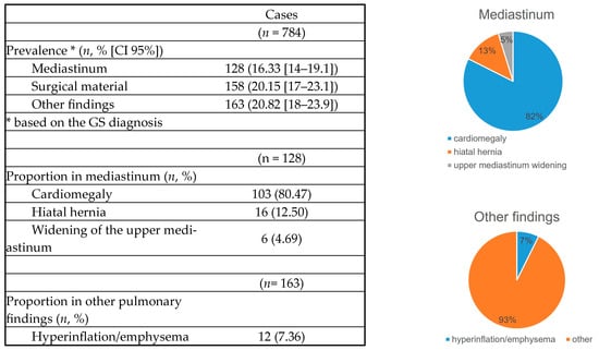 The prevalence of other variables included 16% for mediastinal abnormalities (cardiomegaly, hiatal hernia, widening of the superior mediastinum), 20% for surgical material (staples, metal valves, stents), and 20% for other pulmonary findings (pulmonary hyperinflation). Cardiomegaly was the most frequent finding (80%). Hyperinflation was found in only 7% (Figure 5 and Figure 6).