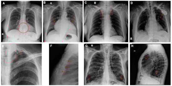 Chest radiographs with additional findings highlighted by red circles, arrows, or lines. (A) Hiatal hernia, (B) cardiomegaly, (C) widening of the superior mediastinum, (D) heart pacemaker, (E) pulmonary surgical material, (F) sternal surgical material, (G,H) pulmonary hyperinflation (G—flattening of the diaphragms and enlarged retrosternal space; H—enlarged retrocardiac spaces).