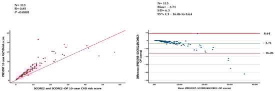Correlation and Bland–Altman analyses were performed in 113 patients. The PREVENT 10-year ASCVD risk scores were strongly correlated with SCORE2 system 10-year CVD risk scores (r = 0.85, p < 0.001), and the Bland–Altman plot analysis showed a bias of −3.71 points. The limits of agreement were −16.06 and 8.64 with the 95% CI (Figure 1). The correlation and agreement between the two scoring systems were good, but the risk categories were significantly different (p < 0.0001) (Table 3).