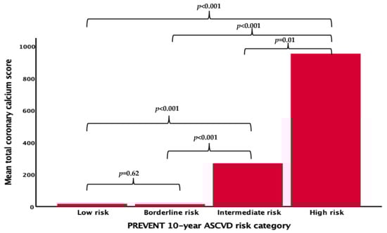 Differences in the computed tomographic findings according to PREVENT 10-year ASCVD risk score categories.