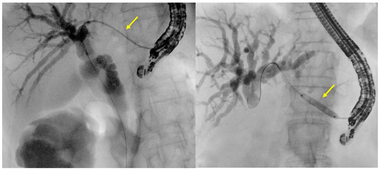 - Toyonaga, H.; Hayashi, T.; Kin, T.; Hama, K.; Iwano, K.; Nakamura, R.; Katanuma, A. Combination of ERCP with endoscopic ultrasound-guided hepaticogastrostomy and hepaticoduodenostomy for biliary drainage in malignant hilar biliary obstruction. Endoscopy 2022, 54, E912–E913. [Google Scholar] [CrossRef] [PubMed]