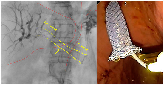 - Nakai, Y.; Sato, T.; Hakuta, R.; Ishigaki, K.; Saito, K.; Saito, T.; Takahara, N.; Hamada, T.; Mizuno, S.; Kogure, H.; et al. Long-term outcomes of a long, partially covered metal stent for EUS-guided hepaticogastrostomy in patients with malignant biliary obstruction (with video). Gastrointest. Endosc. 2020, 92, 623–631.e1. [Google Scholar] [CrossRef]