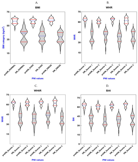 The PNI levels for patients with prediabetes (white color) or diabetes (gray color) vary in different quarters of the obesity-related indices: (A) BMI; (B) WHR; (C) WHtR; (D) BAI. Violin plot represents values of indices; horizontal blue lines represent median values accompanied by the quartiles represented by horizontal red lines.
