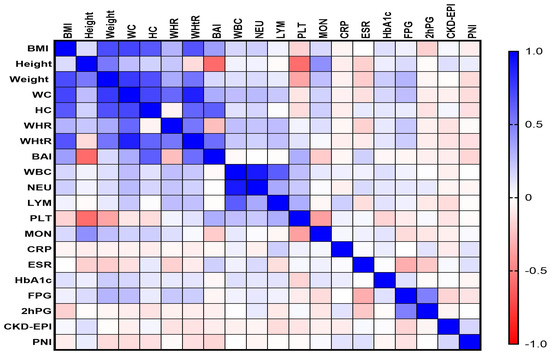 Spearman’s coefficients (−1 < rho < 1) were used to see if there were any significant correlations between the levels of BMI, height, weight, WC, HC, WHR, WHtR, BAI, ALB, CRP, WBC, NEU, LYM, MON, PLT, PNI, and ESR.