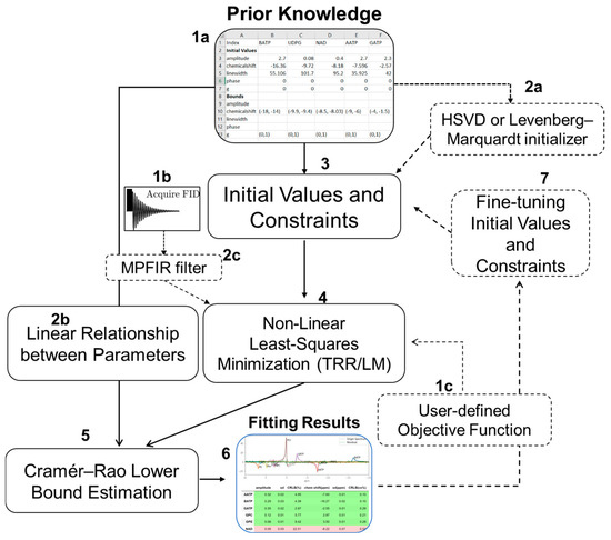 Flowchart of pyAMARES. The workflow starts with importing prior knowledge from spreadsheets (1a) and loading the FID signal (1b) to establish initial values and constraints for fitting (3). If the initial parameters are far from the actual values, users can optionally employ Hankel singular value decomposition (HSVD) or Levenberg–Marquardt (LM) initializers to optimize these starting values (2a). The FID signal can be processed directly or optionally filtered using MPFIR to focus on specific spectral regions (2b). The non-linear least-squares minimization (4) using either trust region reflective (TRR) or LM, with either default or user-defined objective functions (1c). The fitting process can be iterative—the output can be fine-tuned and used as initial parameters for subsequent iterations (7). The Cramér–Rao lower bound (CRLB) estimation (5) integrates information from both the fitting results and the linear relationships between parameters (2b). These relationships include constraints like fixed amplitude ratios or chemical shift differences between multiplet peaks. The final output (6) includes fitted parameters, their uncertainties (CRLB), and signal-to-noise ratios. Solid arrows indicate the main workflow, while dashed arrows and boxes represent optional processing steps.