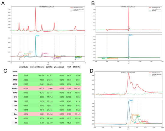 Figure 2 and Figure S2 show the standard outputs of pyAMARES. For each spectrum (Figure 2A,B,D), the upper panel displays the original spectrum, fitted spectrum, residuals, and independent fitted components. Although AMARES is a time-domain fitting strategy, the plotAMARES function of pyAMARES performs a Fourier transform on the original and fitted FID signals and optionally applies phase correction when needed (Figure 2A). Figure 2C shows the simple HTML output spreadsheet of the fitting results of 31P MRS, with each row representing a metabolite. Metabolites whose peak amplitude CRLBs are below a customized threshold (default 20%) are colored green, indicating reliable fits. Otherwise, the corresponding metabolites are colored red. In the resultpd Pandas dataframe [32] of the fitting result, the multiplet peaks are shown as a single peak, while the amplitude of individual singlet peaks is available in the result_multiplet dataframe. The prior knowledge dataset and the corresponding HTML output for spreadsheets for 129Xe, and 2H can be seen in Figure S2. It should be noted that in the 129Xe fitting (Figure 2B and Figure S2A,C), the lineshapes for gas and red blood cells (RBC) are set to be Lorentzian (g = 0), while the lineshape for membrane is fit as a Voigt (initial value: g = 0.1) to account for its structural heterogeneity [33].