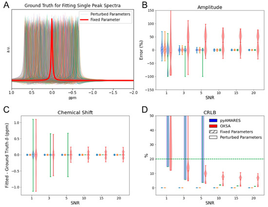 Comparison of Monte Carlo simulated single-peak spectra fitting using OXSA and pyAMARES. (A) Ground truth for spectra simulation with fixed (red) and 3000 perturbed (various colors) parameters. Gaussian noise is omitted for clarity. (B) Relative bias of fitted amplitude compared to ground truth at different SNR levels. (C) Bias of fitted chemical shift compared to ground truth at different SNRs. (D) CRLB of fitted amplitude at each SNR, with the 20% threshold indicated by a green dashed line. In (B–D), blue and red represent pyAMARES and OXSA fitted results, respectively; solid patterns indicate results from spectra simulated with perturbed parameters, while hatched patterns show results from spectra simulated with fixed parameters.