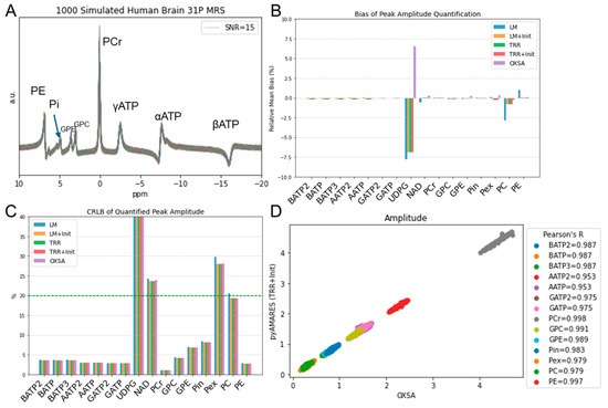 Comparison of Monte Carlo simulated in vivo human brain 31P MRS spectra fitting at 7T using OXSA and different algorithms implemented in pyAMARES. (A) Ground truth for spectra simulation with slightly perturbed parameters. Gaussian noise is omitted for clarity. (B) Relative bias of peak amplitude quantification compared to ground truth. (C) CRLB of fitted amplitude for each peak, with the 20% threshold indicated by a green dashed line. (D) Pearson’s correlation coefficient (R) between OXSA and pyAMARES quantified amplitudes. Abbreviations: LM: Levenberg–Marquardt algorithm; TRR: trust region reflective algorithm; Init: Initializer using LM; PCr: phosphocreatine; PE: phosphoethenolamine; GPE: glycerophosphoethanolamine; GPC: glycerophosphocholine; Pi: inorganic phosphate; NAD, nicotinamide adenine dinucleotide; UDPG, uridine diphosphoglucose.