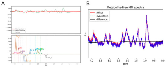 Using AMARES for post-processing: Removal of metabolite residuals from a short echo time (TE) 1H MR spectrum at 9.4T. (A) Upper panel: Fitting of residual metabolites (red) and the resulting macromolecule (MM) spectrum after subtraction of residual metabolite signals from the original spectrum (green). Lower panel: AMARES modeling of residual metabolite signals. (B) Comparison of metabolite-free MM spectra obtained by jMRUI (red) and pyAMARES (blue), showing identical results as confirmed by the flat difference spectrum (black).