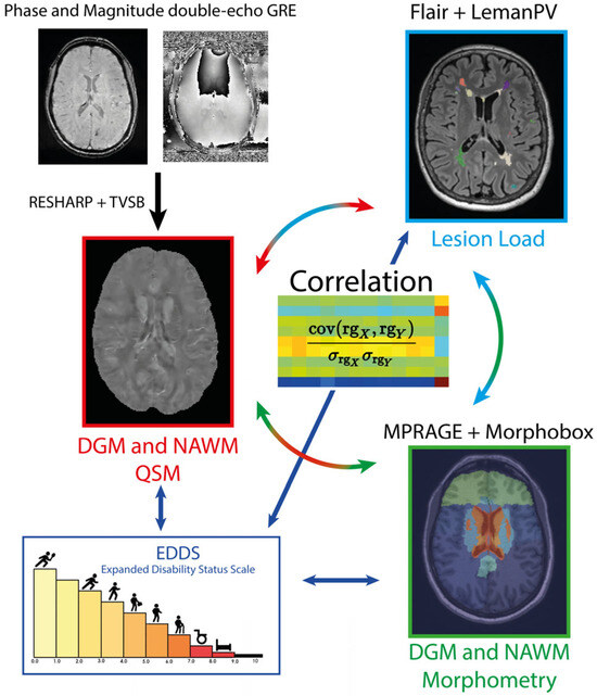The main goal of this study was thus to assess the feasibility of a fully automated quantitative segmentation method. Second, we aimed at evaluating the potential interrelation between lesion load and susceptibility and morphometry in DGM and NAWM and between NAWM susceptibility and DGM susceptibility. Finally, we evaluated the interrelation between these imaging markers and individual clinical disability.