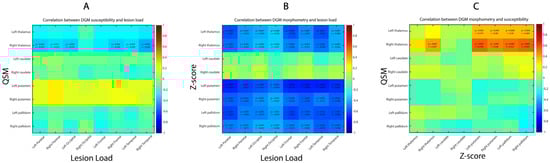 Correlation between lesion load, DGM susceptibility and morphometry. (A) Interrelation between lesion load (abscissa) and DGM susceptibility (ordinate). (B) Interrelation between lesion load (abscissa) and DGM morphometry (ordinate). (C) Interrelation between DGM morphometry (abscissa) and susceptibility (ordinate). Only correlation coefficients with significant p-values are written down, with threshold value corrected for multiple comparison.