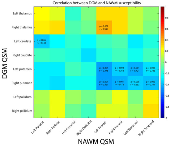 Correlation between DGM and NAWM susceptibilities. Only correlation coefficients with significant p-values are written down, with threshold value corrected for multiple comparison.