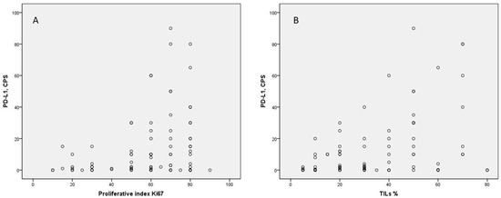 Correlation between PD-L1 and TILs, rho = 0.396, p < 0.001 (B) and PD-L1 and Ki-67, rho = 0.236, p = 0.027 (A).