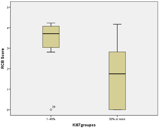 Ki-67 by Residual Cancer Burden Score strata. The middle line indicates the median value, and the bottom and top edges of the box represent the 25th and 75th percentiles, respectively. The whiskers extend to the most extreme data points that are not considered as outliers, and the outliers are plotted individually using circle sign. The mean RCB score for highly proliferative tumors was 1.59509, compared to 3.16486 in cases with a Ki-67 index below 50% (Mann–Whitney U = 53, p = 0.022, Effect size r = 0.4).