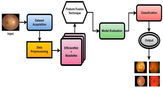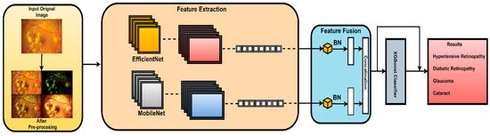 In this work, a novel system named CAD-EYE, combining the strengths of EfficientNet and MobileNet, is introduced. The CAD-EYE approach is deployed to categorize images of eye diseases, discerning between diabetic retinopathy, hypertensive retinopathy, glaucoma, contrast-related issues, and normal cases. Within the CAD-EYE system, the feature fusion methodology of EfficientNet and MobileNet is utilized to extract valuable features, employing transfer learning for training on eye-related abnormalities. The CAD-EYE system incorporates essential mechanisms for detecting images depicting eye diseases and recognizing the mentioned issues. The system steps are presented in Figure 2. Throughout the training phase, the parameters are continuously refined by fusing the characteristics from EfficientNet and MobileNet. To combine features using element-wise multiplication, a feature transform layer is added. Lastly, the application of an XGBoost classifier increases the classification results.
