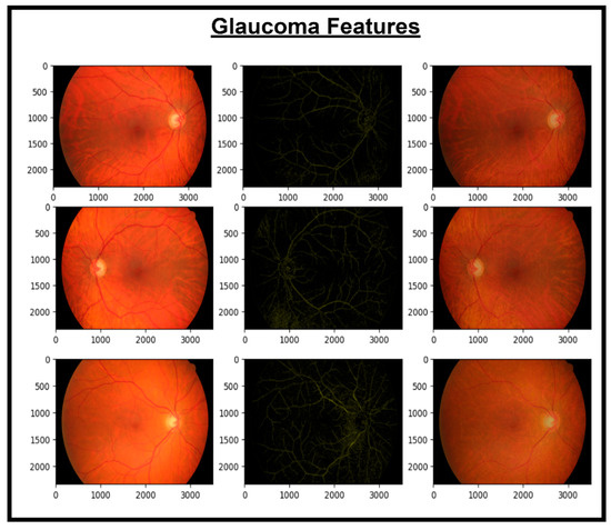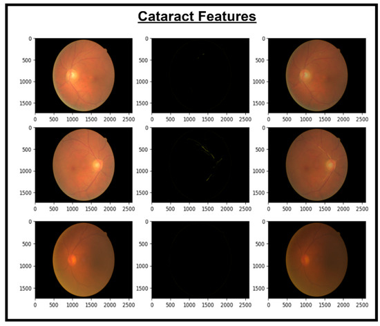 The proposed model (CAD-EYE) was trained and tested using the Multiple_EYE dataset that was collected especially for this work. This dataset contains 65,871 photos. These images were collected from different private and public sources. The sources included internet platforms and ophthalmic treatment facilities. In the collection processes, the Maestro2 OCT-Fundus Camera system is used, which is a user-friendly device that performs automatic alignment, focus, and capture with a single touch. This system enables a detailed analysis of the macula, optic disk, and anterior segment, with reports that can be automatically exported, printed, or integrated with EMR systems in common file formats. Explicit consent to use the data in research activities was acquired from patients and their doctors, with a promise of confidentiality of the data. This ensures accessibility of the data for other researchers while protecting the patients’ privacy. The collected dataset (Multiple-Eye) contains eye images pertaining to different eye conditions like diabetic retinopathy, hypertensive retinopathy, glaucoma, and contrast, and normal images. The training dataset was divided into normal class and eye disease photos by qualified ophthalmologists. The ophthalmologists’ experience in detecting eye-related traits was quite helpful in dividing the dataset. It used the Fluorescence Imaging Simulation preprocessing approach to enhance the image and make the feature extraction process more accurate. The technique strengthens the green channel of the image, imitating fluorescence, which is critical in some pathologies of eye fundus images. Fluorescence Imaging Simulation increases the visibility of these regions to clearly explain where the model is looking while deciding. More generally, the integration of the Fluorescence Imaging Simulation technique reflects a continued effort to increase transparency and thus reliability of deep learning models for improved accessibility and trustworthiness in numerous applications, as shown in Figure 3.