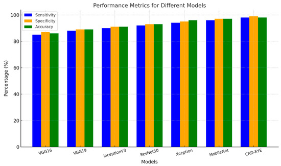 In the first experiment implemented to test the proposed DL model, a comparison is made between the proposed model and other deep learning models like DenseNet-169, InceptionV3, VGG16, and MobileNet. All models were trained for an equal number of epochs. Comparative findings for accuracy, specificity, sensitivity, and F1-score between the CAD-EYE system and the MobileNet, VGG16, VGG19, Xception, InceptionV3, and ResNet models are shown in Table 8. The outcomes show that the CAD-EYE has better performance than other DL models. Figure 9 shows a graph that compares various DL models with the CAD-EYE model.