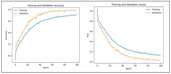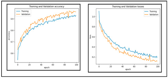 In this work, we assessed the efficiency of our proposed CAD-EYE technique using the eye disease classification (EDC) dataset [56] that was investigated. First, we looked at the loss function and analyzed how well the model performed using the EDC dataset on the training and validation sets. The training and validation accuracy of the CAD-EYE model trained on this dataset can be seen in Figure 12. Results show how exceptionally successful our model is in both training and validation scenarios. Furthermore, by utilizing the EDC dataset outlined in Table 9, we achieved a remarkable 99% accuracy on the validation and training datasets.