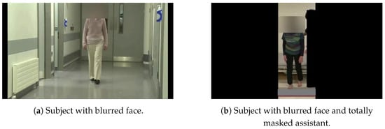 The first subset of videos featured only the subjects, who were visible in all frames, as illustrated in the left image of Figure 1, where the corresponding subject’s face is blurred. The second subset involved severe cases of PD, where medical assistance was required. In this subset, any medical personnel present, in addition to the subject, were fully masked, as shown in the right image of Figure 1.