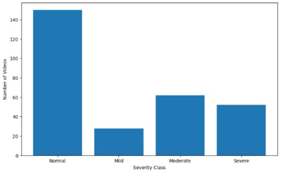 Examining the distribution of the four classes in the dataset, as shown in Figure 2, reveals a notable imbalance. The “normal” class, representing healthy subjects, contains significantly more videos than the other classes. Moreover, within the categories of subjects labeled as having varying degrees of PD, the “mild” class has only half as many videos as each of the other two classes. At this stage, the data remain in their raw form; as we will discuss later, several techniques will be employed to introduce balance among the classes.