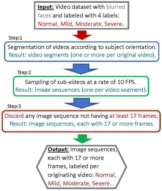 The third step involves discarding segments that yield fewer than 17 frames after sampling. Frames from each segment are kept separately and labeled according to their originating sequence and/or video. It is important to note that most videos result in frame sequences that capture the subject in the various orientations listed above. Proper segmentation of the videos is crucial for generating a relevant and de-noised SEI dataset []. This dataset is used in the subsequent sections of this study.