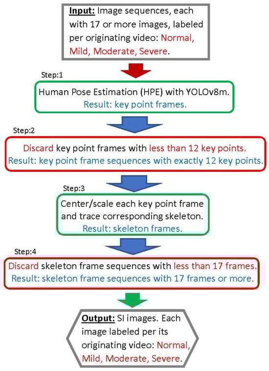 This subsection details our second workflow, illustrated in Figure 5, and designated as the SI workflow. Its objective is to apply humain pose estimation on the sequences of images resulting from the pre-processing workflow of the previous subsection. This results in sequences of SIs corresponding the the image sequences. Note that the steps of the workflow have frame colors indicating their types of function as indicated in the previous subsection.