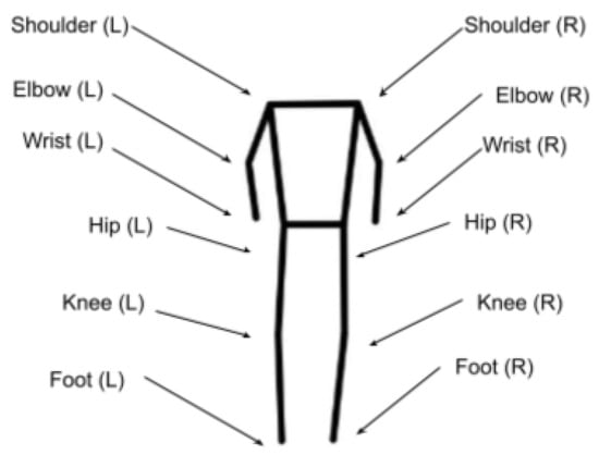 Figure 6 illustrates the joints corresponding to a human skeleton, returned as key points by the HPE model. To understand how the HPE model works, we designate these key points with the following notation,