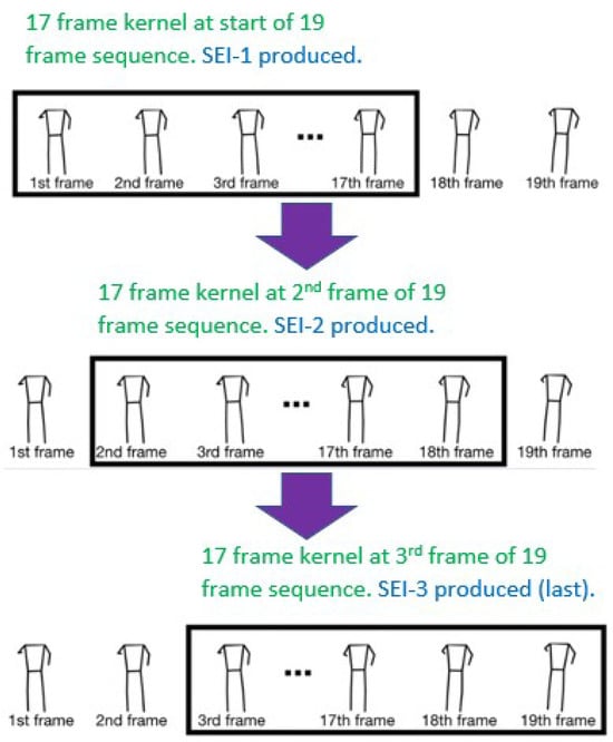 Our approach further differs from [] by employing a rolling kernel to generate multiple SEIs from a sequence of skeleton images. This process is illustrated in Figure 8. When the sequence contains more than 17 skeleton images, the first 17 images are used as the kernel to produce the initial SEI. The kernel is then moved to start with the next image, and so on, until the last kernel captures the final 17 skeleton images in the sequence. In the case the sequence contains exactly 17 frames, obviously, only one SEI is produced from it. Moreover, recall that sequences with fewer than 17 frames were entirely discarded during the pre-processing stage.