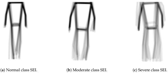 In our analysis of the synthesized SEI dataset, we concluded that effective classification requires a focus on the global aspects of SEI images rather than on specific detailed features. This is illustrated by the SEI images in Figure 9, which represent three classes from the dataset: normal, moderate, and severe. Notably, posture is a key differentiator; the normal class displays a more upright stance compared to the others. Additionally, the severe class is characterized by slow-moving feet. Overall, the normal SEI exhibits correct posture with sharp, fast limb movements, while the moderate and severe classes display slower movements and more stooped postures.