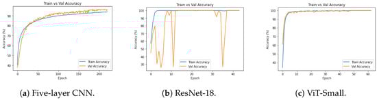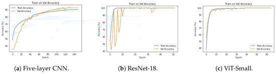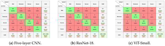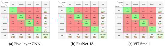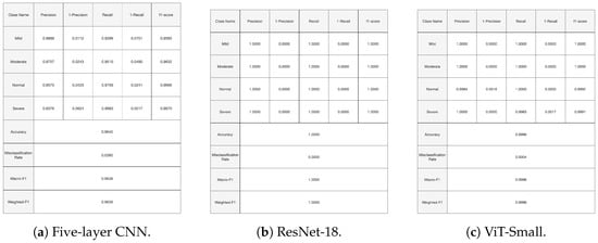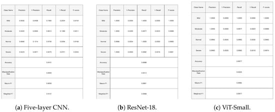 Figure 13 shows the training and validation curves for the top three performing models. At the end of the training period, all models present significant training and validation accuracies. Moreover, Figure 14 and Figure 15 present the confusion matrices and the classification report for the three models. All the evaluation criteria values, precision, recall, and F1-score, are significant for all classes for the Vit-Small and ResNet-18 models. For the five-layer CNN, the evaluation criteria values are lower than for the other models. The accuracy for the least represented mild class improved a bit with the oversampling we used in this experiment.