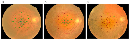 Schematic representation of 3 zones including the fovea, parafoveal inner ring, and parafoveal outer ring (dotted lines) on microperimetry. (a) The right eye of a 55-year-old female with mean sensitivity of 23.0 dB and best-corrected visual acuity (BCVA) of 20/30. (b) The right eye of a 65-year-old male with BCVA of 20/40 and mean retinal sensitivity of 15.5 dB. (c) The right eye of a 72-year-old woman with BCVA of 20/70 and mean retinal sensitivity of 1.6 dB.