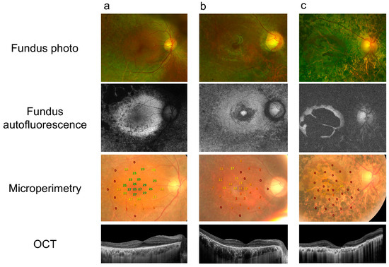 Optical coherence tomography (OCT) is a typical method in retinal disease analysis, and several studies have reported the use of OCT to follow ellipsoid zone (EZ) changes in RP patients [4,5,6]. However, there is difficulty in evaluating transverse structural OCT changes and their correlation to visual acuity (VA), especially in advanced stages once EZ integrity is lost [4]. Meanwhile, fundus autofluorescence (FAF) imaging provides information not evident through conventional fundus photos by enabling lipofuscin visualization at the level of the retinal pigment epithelium (RPE) cell monolayer [7,8]. FAF is a convenient, fast, and noninvasive imaging procedure, and its potential as a prognostic marker has been shown to identify distinctive distributions in retinal dystrophies [8,9].