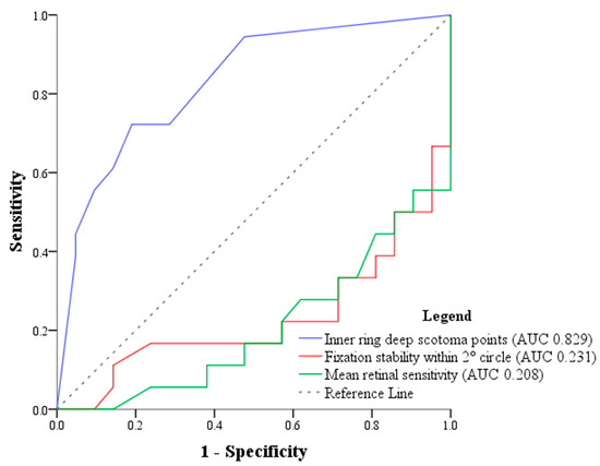 Receiver operating characteristic (ROC) curves and area under the curve (AUC) of significant microperimetric variables. Blue line: number of inner ring deep scotoma points (AUC = 0.829), the cut-off point for number of deep scotoma points at the inner ring was 3.5; red line: fixation stability within the 2° diameter circle (AUC = 0.231); green line: mean retinal sensitivity (AUC = 0.208). The dotted line represents the reference line (no discrimination).