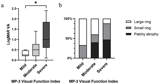 Significant correlations between MP-3 severity grading with (a) logMAR VA (p = 0.01) and (b) FAF patterns (p = 0.016). MP-3 severity grading is classified as mild (zero deep scotoma points at the inner ring, n = 12), moderate (less than 4 deep scotoma points at the inner ring, n = 10), and severe (4 or more deep scotoma points at the inner ring, n = 17). * p < 0.05.