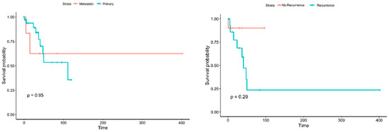As the collected data had details for each patient, it was feasible to perform various inferential statistics to evaluate possible differences related to diseases, patients, or other characteristics. Differences in the survival of patients with metastatic disease from patients with primary tumors were not possible to be confirmed (p = 0.95) (see Figure 3) nor were the differences between the groups of patients with and without recurrence (p = 0.29). Notably, there is a trend for better survival of the patients without recurrence; however, larger data sets are required for robust statistical confirmation.
