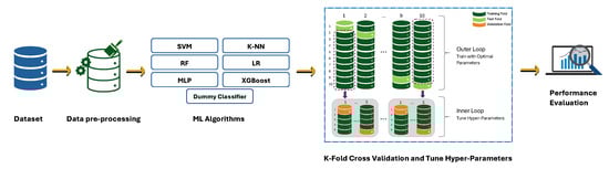 Our research methodology involved an initial preprocessing phase, in which the data sets were standardised and normalised. Subsequently, we employed the k-fold cross-validation technique to evaluate the performance of different machine learning models. Furthermore, for hyperparameter tuning, we ran an inner cross-validation with in the overall cross-validation. This research methodology, depicted in Figure 1, allowed us to assess both the immediate and optimised effects of machine learning applications on our data sets.