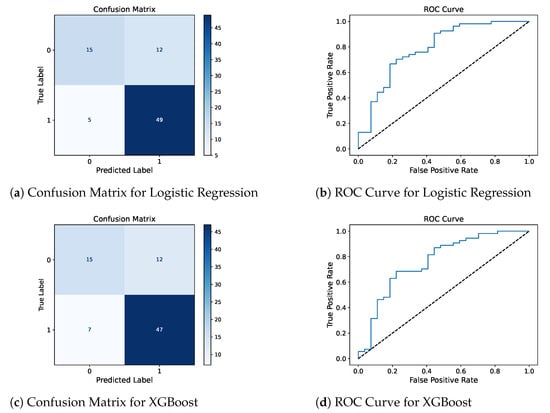 Figure 2. Confusion matrices and ROC curves for logistic regression and XGBoost models. In the confusion matrices (subfigures (a,c)), the true labels are represented on the vertical axis, and the predicted labels are on the horizontal axis, with the color intensity indicating the number of predictions in each category. The ROC curves (subfigures (b,d)) plot the True Positive Rate against the False Positive Rate, demonstrating the trade-off between the two metrics for varying classification thresholds. The diagonal dashed line represents a random classifier (AUC = 0.5), while the blue line shows the performance of the respective model.