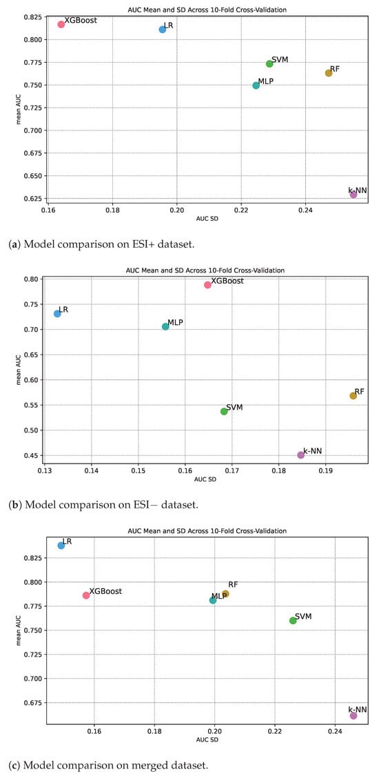 Table 5. Comparative Performance of Machine Learning Models on the merged ESI+ and ESI− data set. The values presented are the averages obtained from the 10-fold cross-validation process.