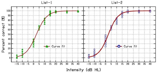The percentage of correct word recognition was calculated for each wordlist at each presentation level. The percentage of correct word recognition for each list at each presentation level was computed. Regression slopes and intercepts were derived for both lists using sigmoid function(Equation (1)) based on the percentage of correct scores across nine presentation levels. Using the percentage of correct scores at nine presentation levels, regression slopes and intercepts were calculated using non-linear regression (Equation (1)) for both lists. The equation used here was same as that used by Lee and Lee [15].