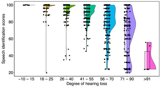 However, for monosyllabic words in English, using large-scale studies on PBmax scores show that PBmax scores start deteriorating from moderate hearing loss [16,36,37,38]. The performance of the hearing-impaired group using the disyllabic wordlist is higher than monosyllabic wordlists across different degrees of hearing loss. One possible reason for the higher performance with disyllabic words may be attributed to the rich contextual cues they provide [19,20,21,22].