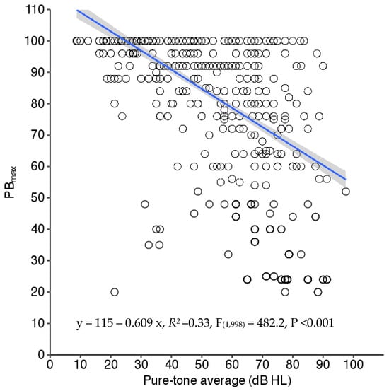 Scatter plot with linear regression shows the relationship between the PBmax and pure-tone average (PTA). The shaded area indicates a standard error.
