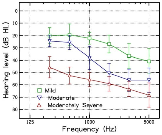 Figure 4. Mean pure-tone thresholds as a function of frequency for three different degrees of hearing loss. The degree of hearing loss is the same as given in Figure 2. The error bar shows the standard deviation. - Stimuli: Disyllabic words (CVCV) were sourced from the Malayalam dictionary. Malayalam has eleven monophthongs and five diphthongs. From these, 17 vowel pairs (combinations) were selected, which were most commonly occurring in Malayalam (See Table 2). At least ten words for each vowel combination were made with different consonants collected and recorded. A native speaker of Malayalam, a 25-year-old female, spoke these words. The recording was conducted in a quiet environment with a noise level of less than 35 dB SPL. The Rode NT-USB+ (RØDE©, Sydney, NSW, Australia) was used to make the recordings. The speaker was instructed to speak at a normal conversational speed and volume. Multiple samples were recorded, and the sample with the minimum perturbation and maximum clarity was selected. Minimum perturbation was based on the Jitter, Shimmer, Harmonic-to-Noise, and Noise-to-Harmonic Ratios, whereas clarity was rated on a seven-point naturalness, clarity, and intelligibility scale, judged by three professional speech–language pathologists. The recordings with minimum perturbation that were decisively judged as the most clear were selected.