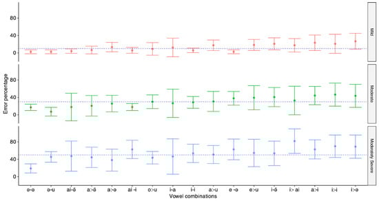 The mean, along with ±1 SD, of the error percentage for disyllabic word identification as a function of vowel combinations for three different degrees of hearing loss. The dotted line indicates the mean error across all vowel combinations for the degree of hearing loss.