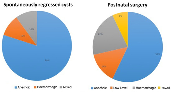 When comparing the two groups (cysts that showed spontaneous regression vs. cysts that underwent surgery), we found that the group of cysts that showed spontaneous regression had a significantly lower mean diameter, both prenatally (p value 0.039) and postnatally (p value < 0.001). The ultrasound features of some of the cysts analyzed are shown in Figure 2, Figure 3, Figure 4, Figure 5 and Figure 6.